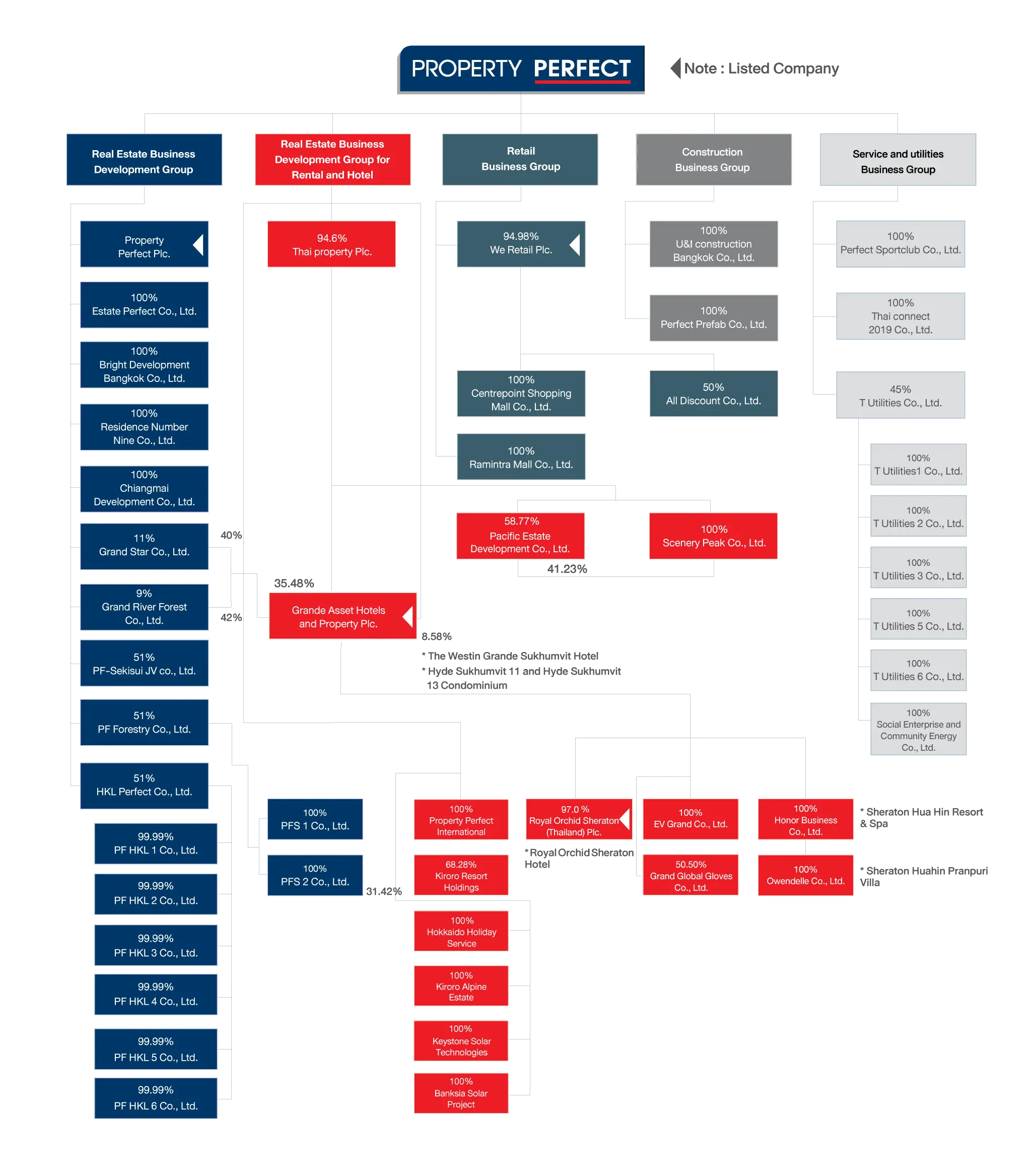 Grand River Forest Company Limited is a joint venture of Sumitomo Forestry Company Limited, Grand Asset Hotels and Property Public Company Limited and Property Perfect Public Company Limited, located at 32nd Floor, Exchange Tower, Room 3203-4, 388 Sukhumvit Road, Khlong Toei, Bangkok. Established on 6 July 2018, the joint venture invests in a property development project for sale on Charoennakorn Road. The initial registered capital of Bt1,600 million is fully paid up. The Company holds 9% direct holding and 17.70% indirect holding.